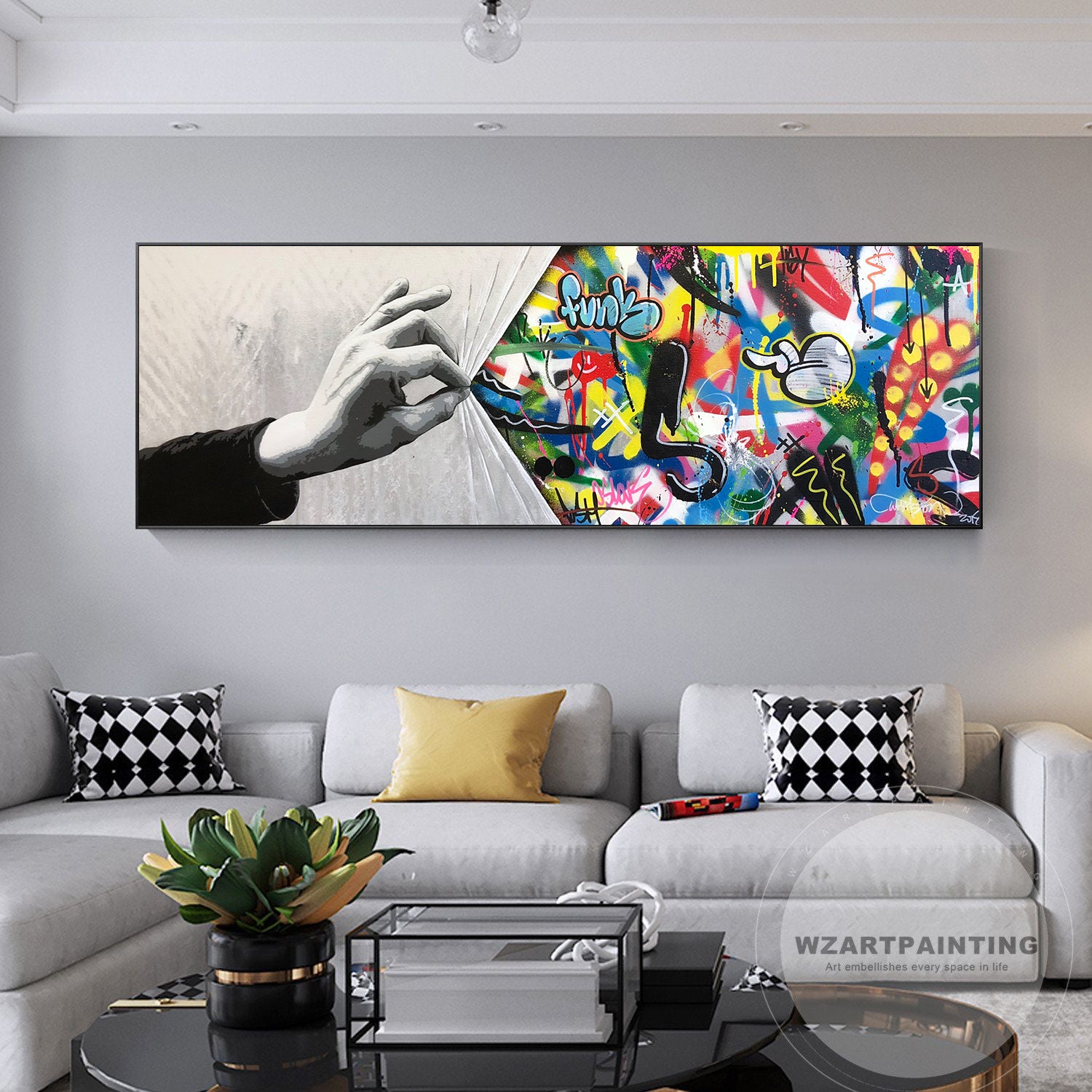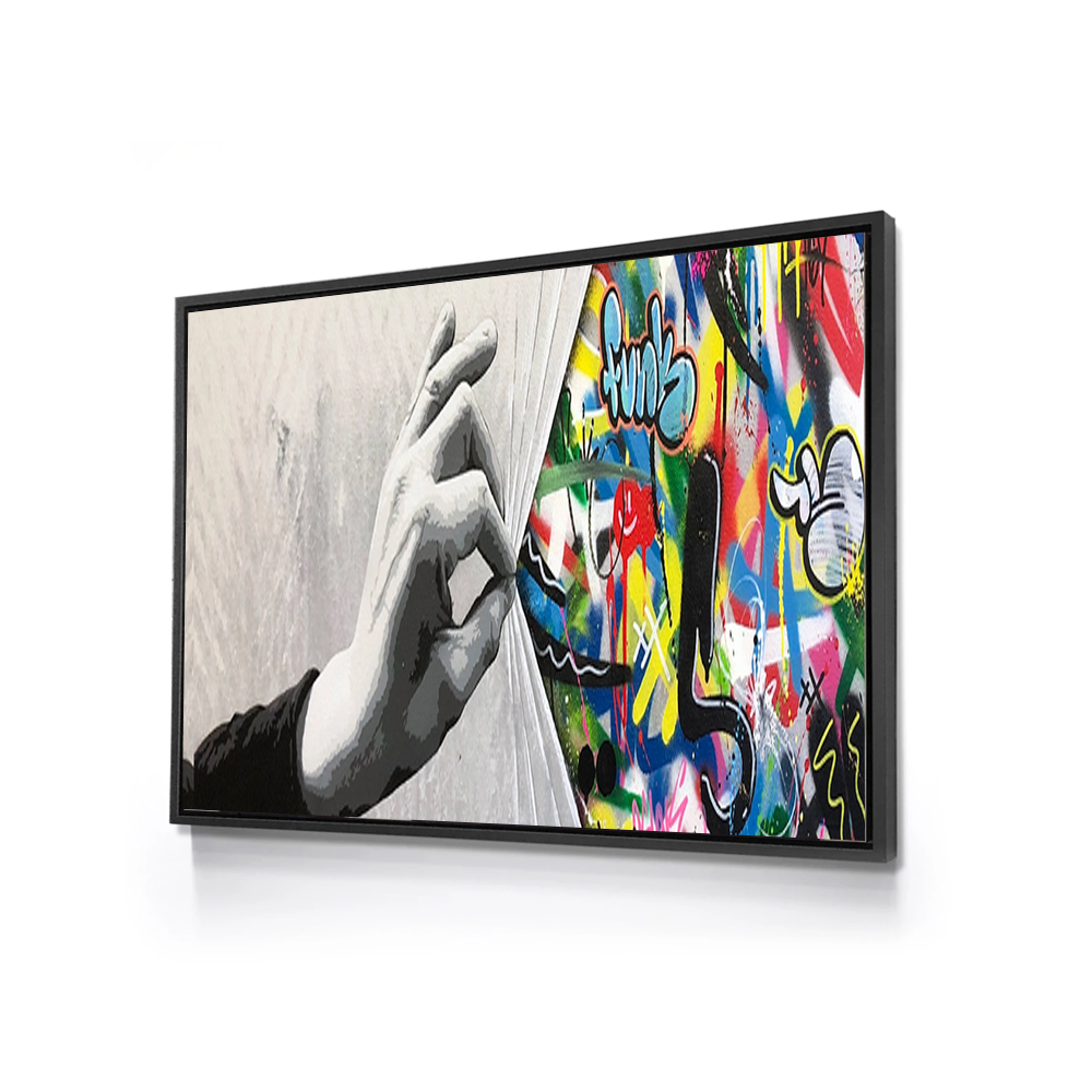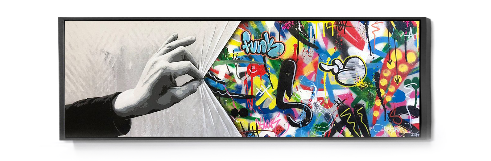 All of our products are stretched over a Pinewood bracing frame, and then a 3 cm black floating frame is attached with all hanging hardware is installed, Its ready to hang